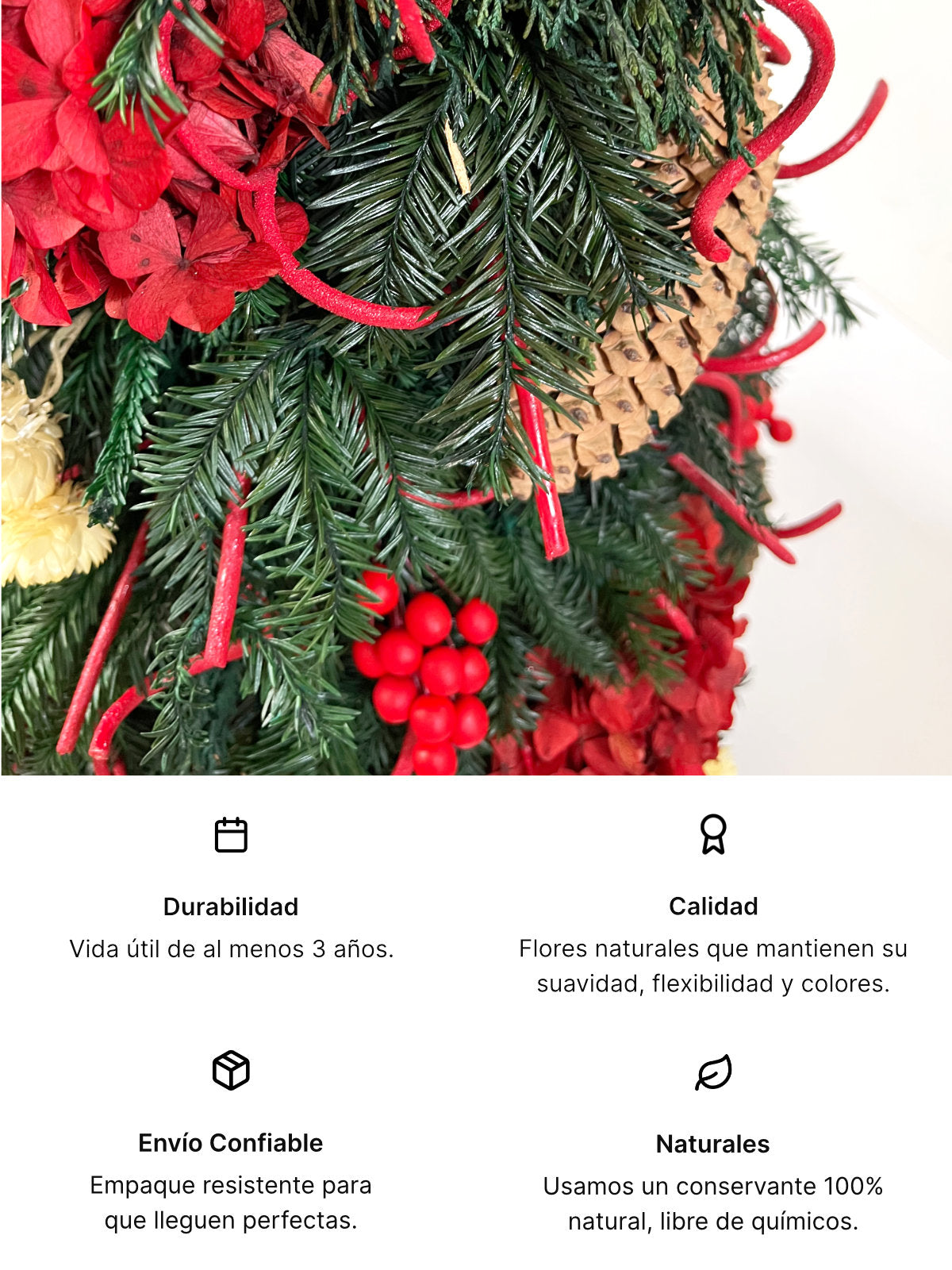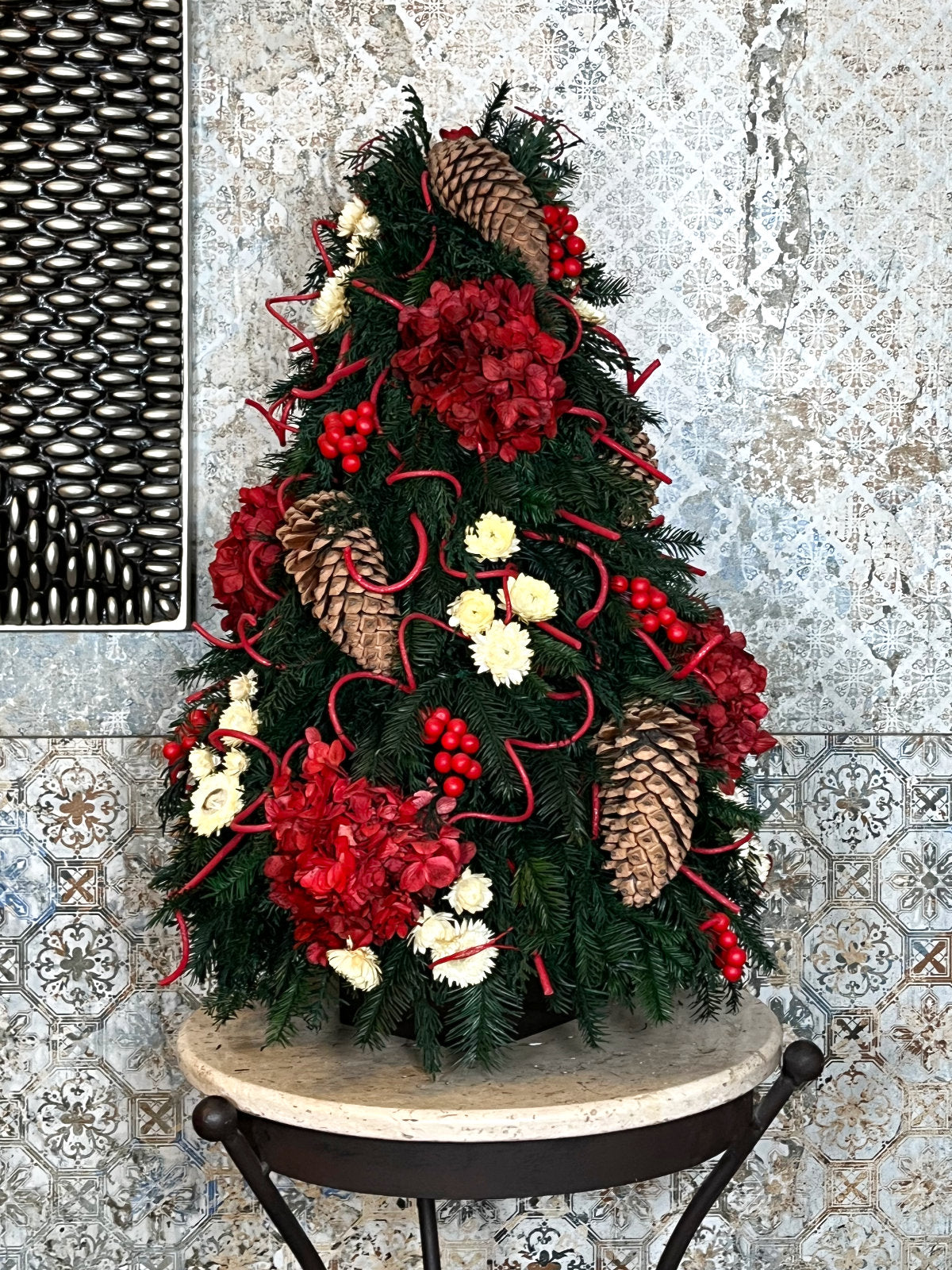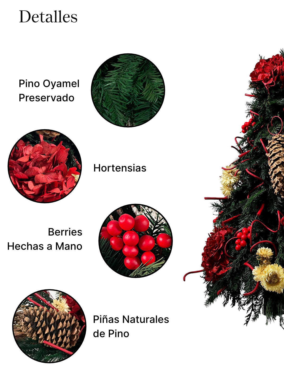 Arbolito de Navidad Rojo 60cm - Follajes Preservados, Berries y Hortensias