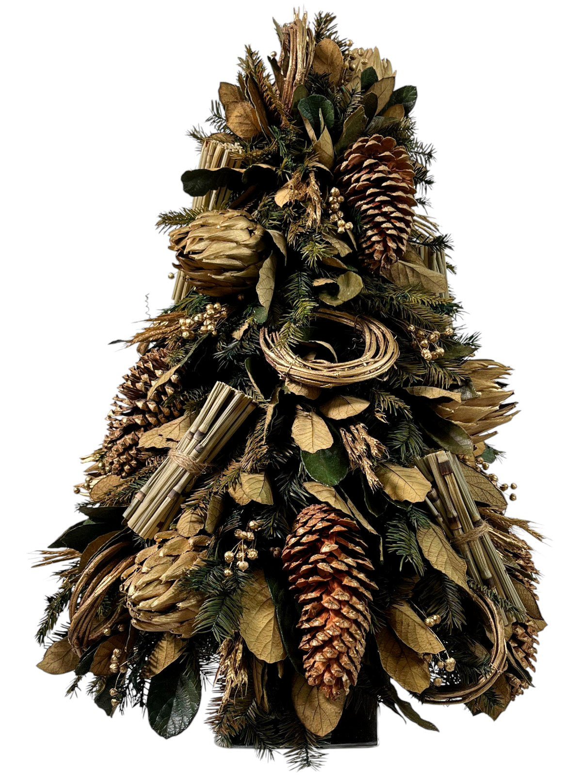 Arbolito navideño con encino, atado cola de caballo, perlita dorada, garapiñas, alcachofa, aros de vara.