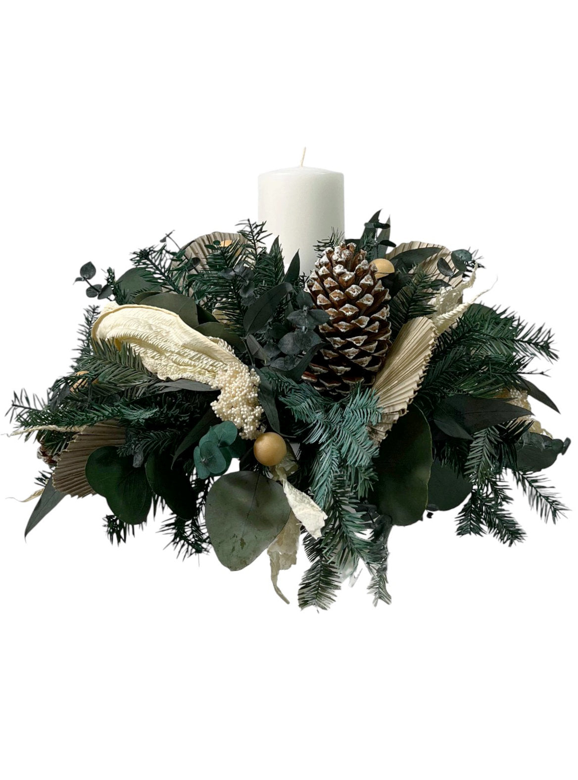 Centro de mesa redondo con oyamel matizado, hoja de eucalipto, dólar silver, dólar mini, garapiñas, mini abanicos, berries blancas, galatea y flor de arroz.