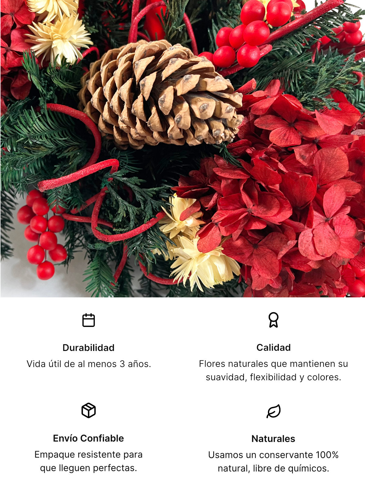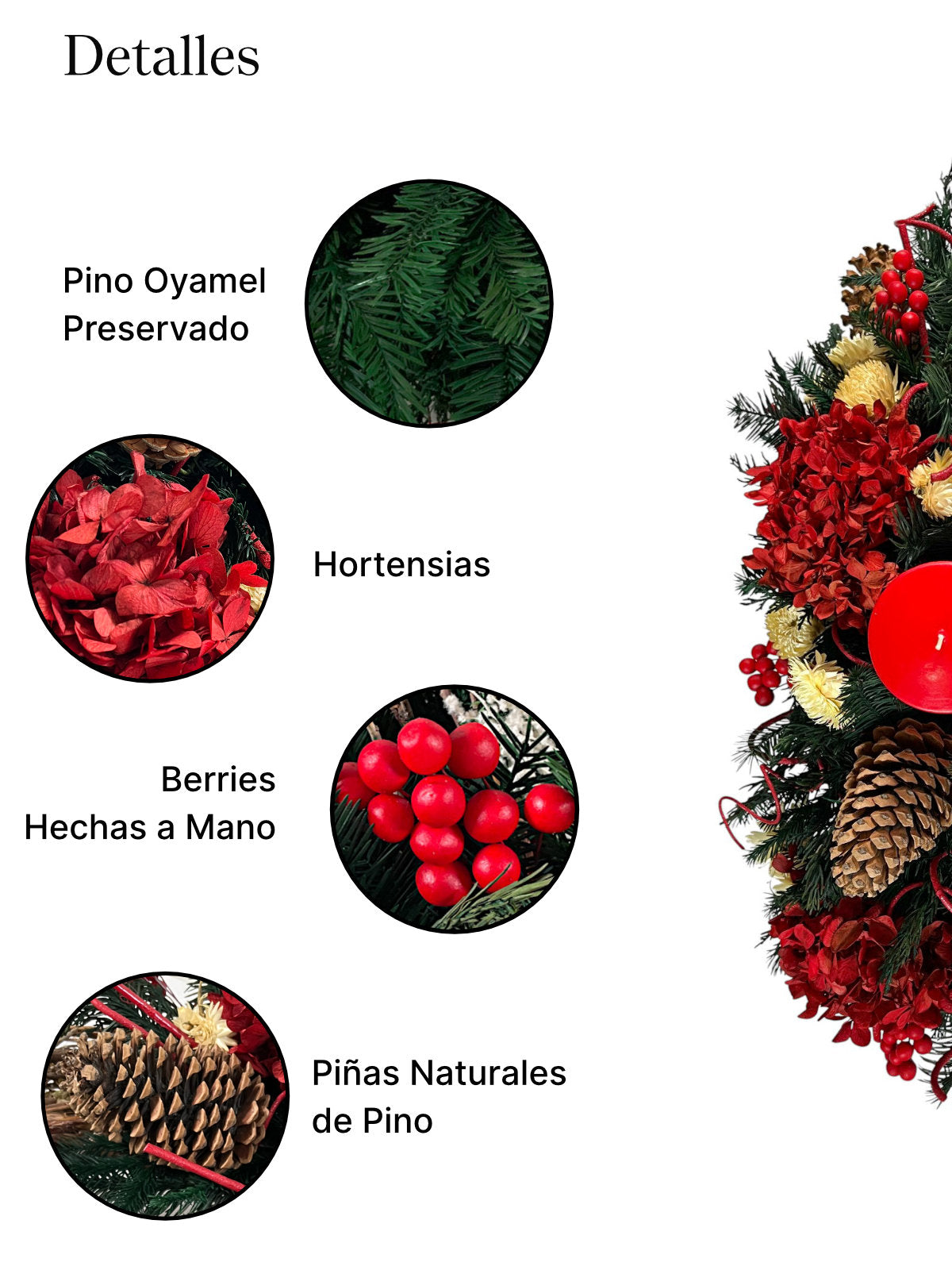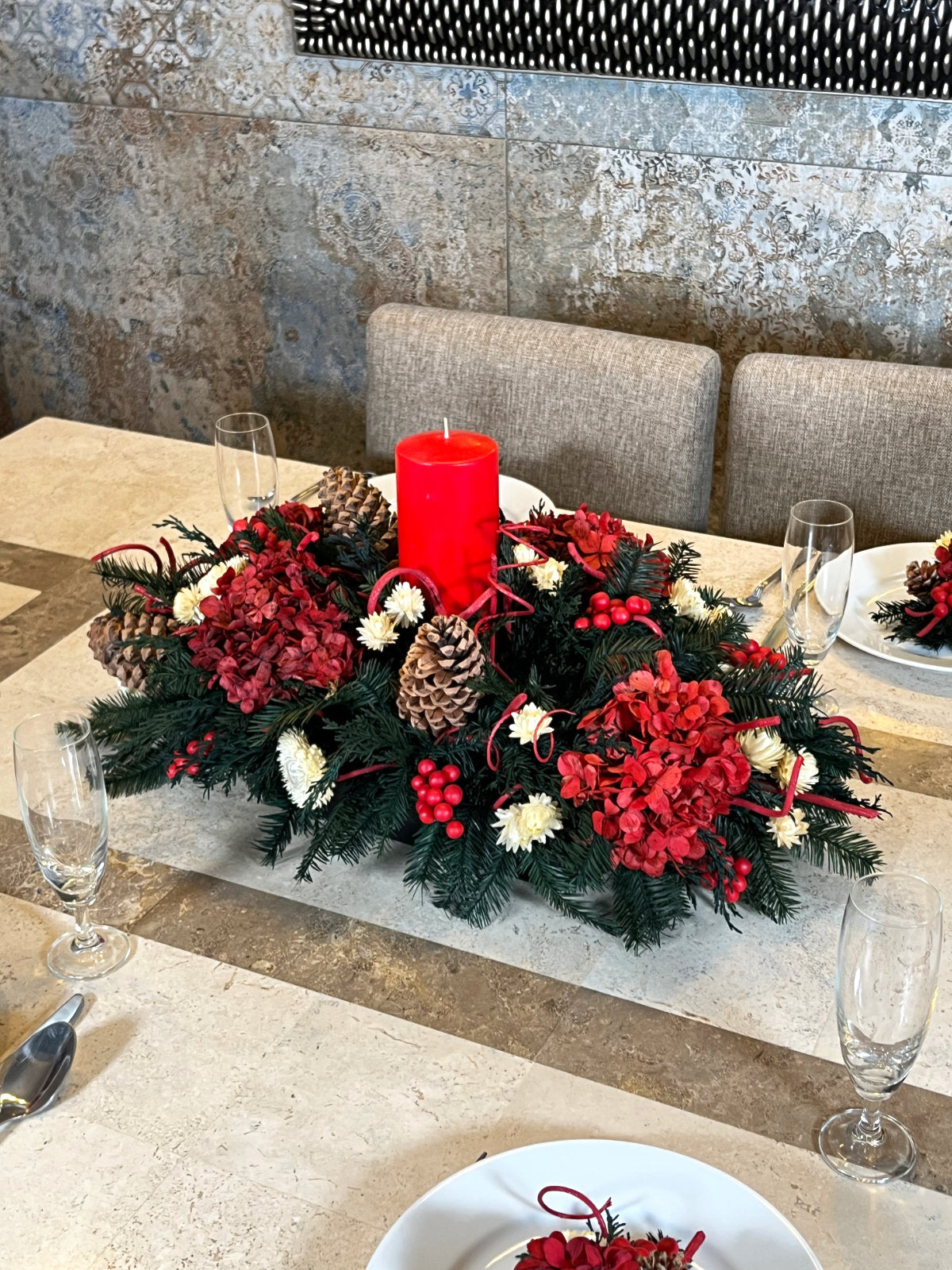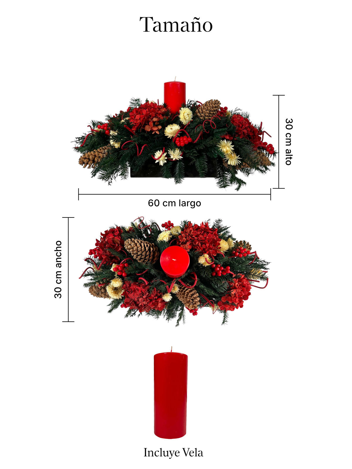 Centro de Mesa Navideño Alargado Rojo con 1 Vela 60cm - Follajes Preservados, Berries y Hortensias