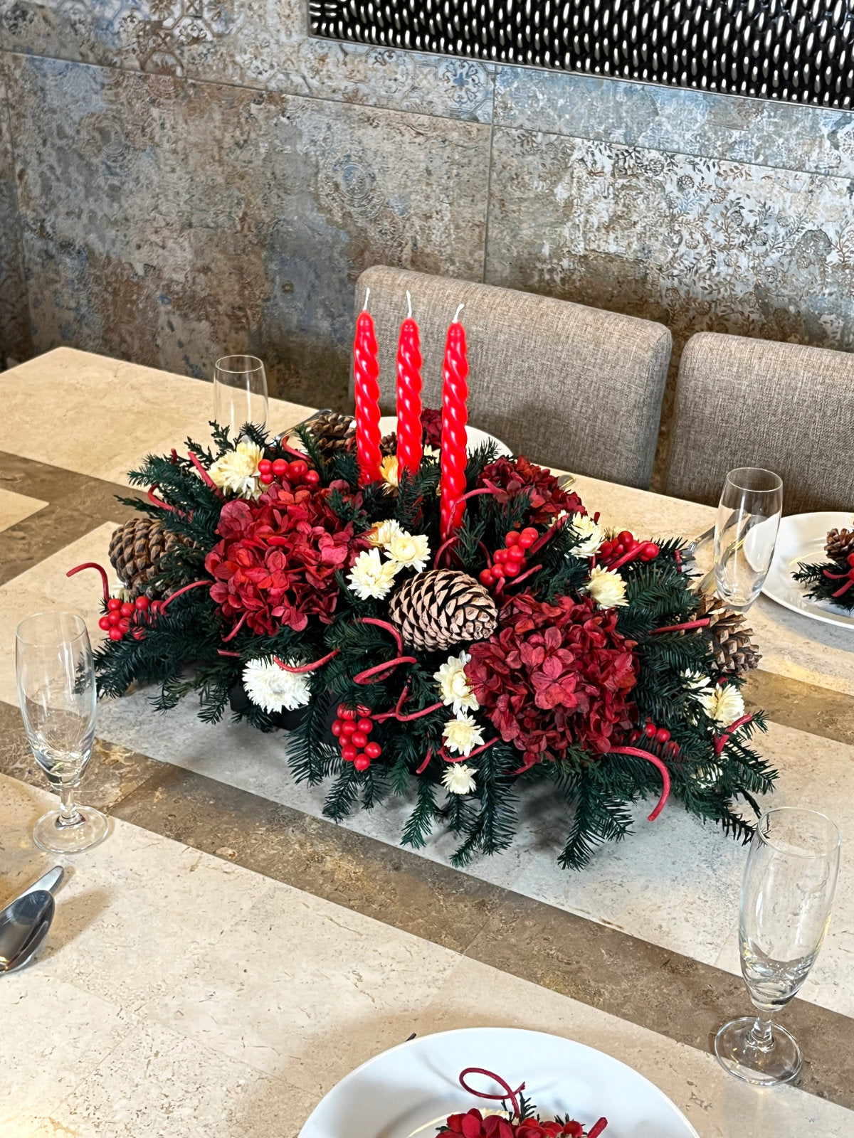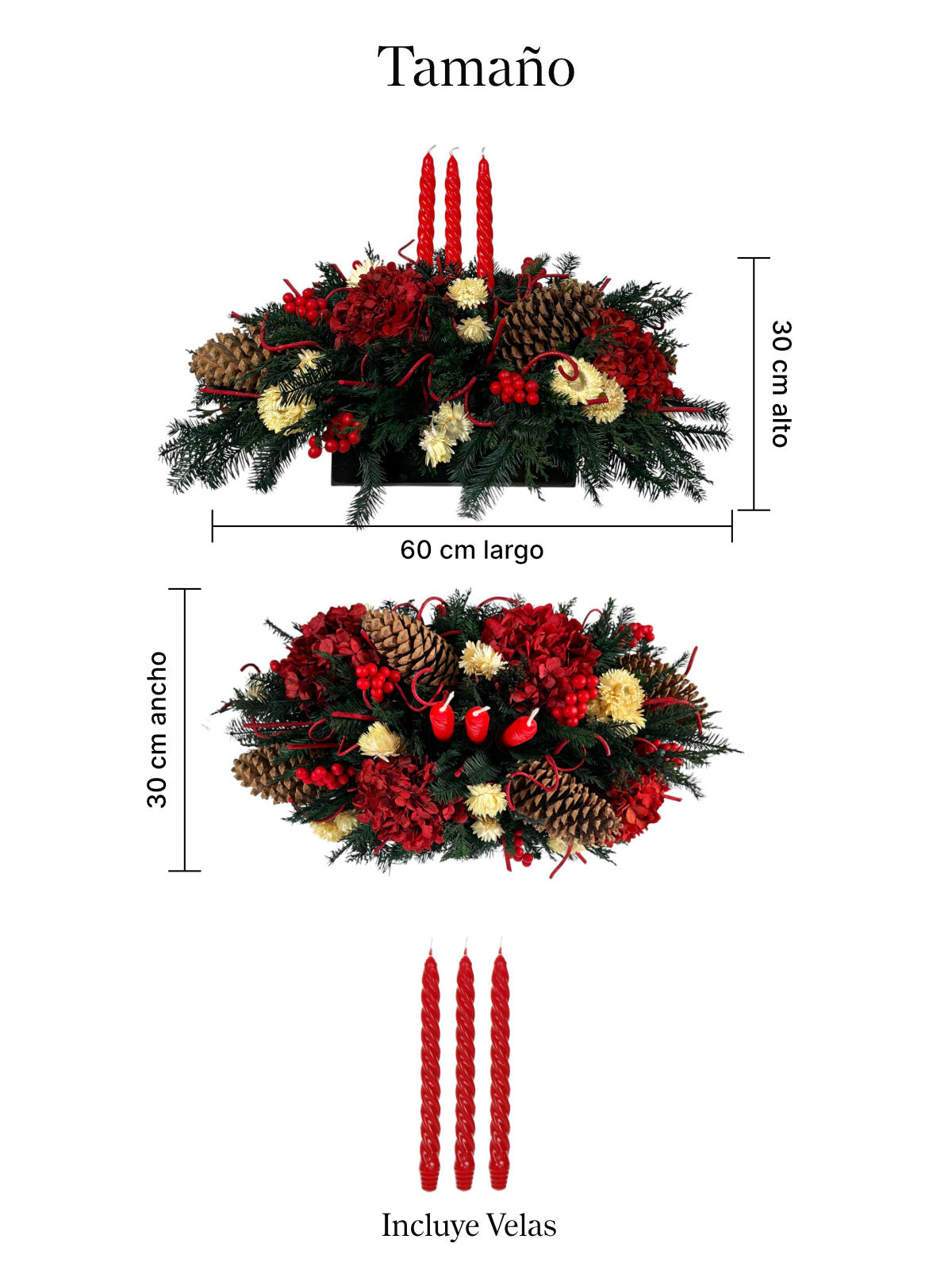 Centro de Mesa Navideño Alargado Rojo con 3 Velas 60cm - Follajes Preservados, Berries y Hortensias