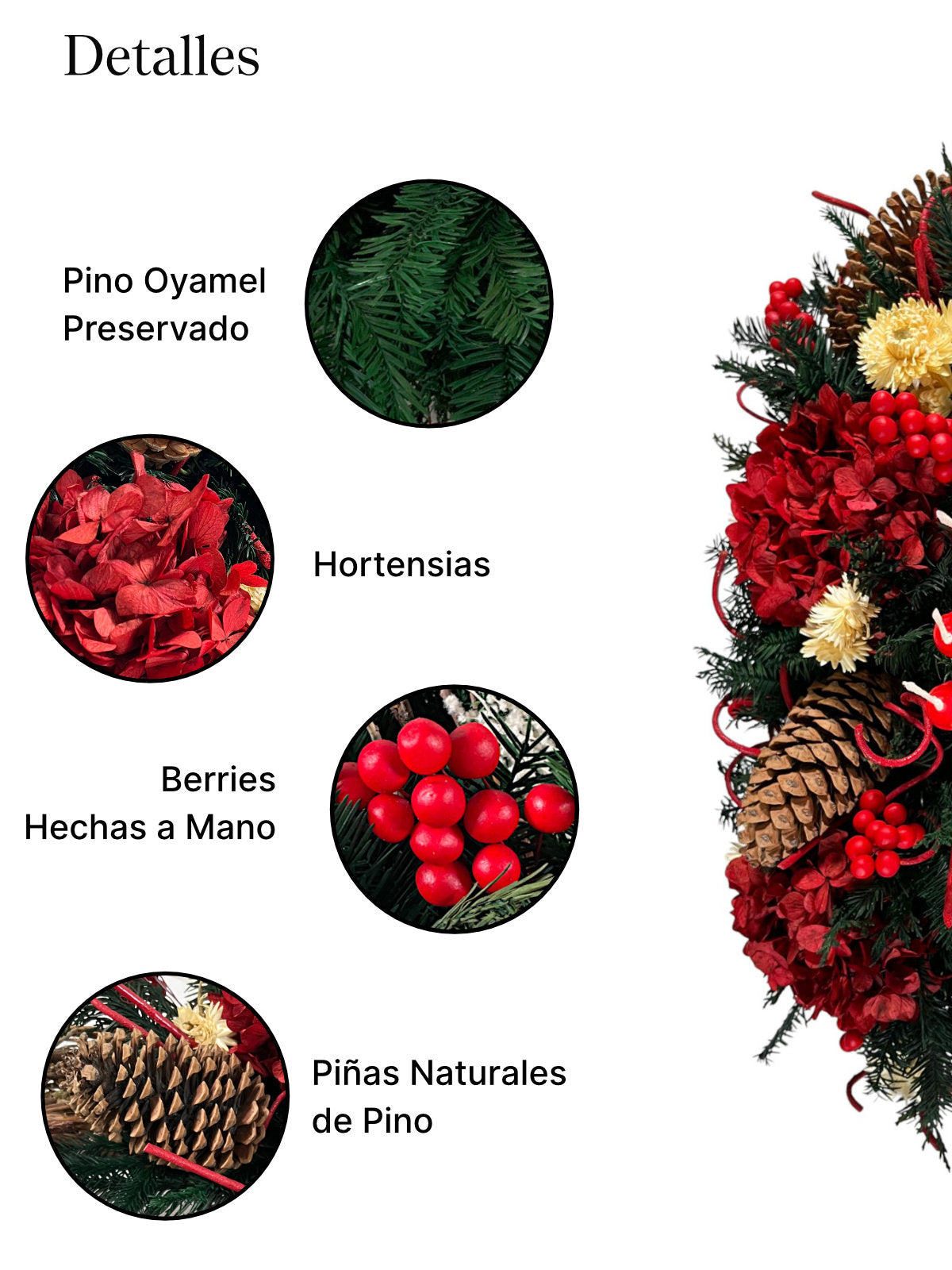 Centro de mesa alargado con oyamel, cedro, hortensias rojas, berries rojas, flores inmortales blancas, espiral rojo y garapiñas.