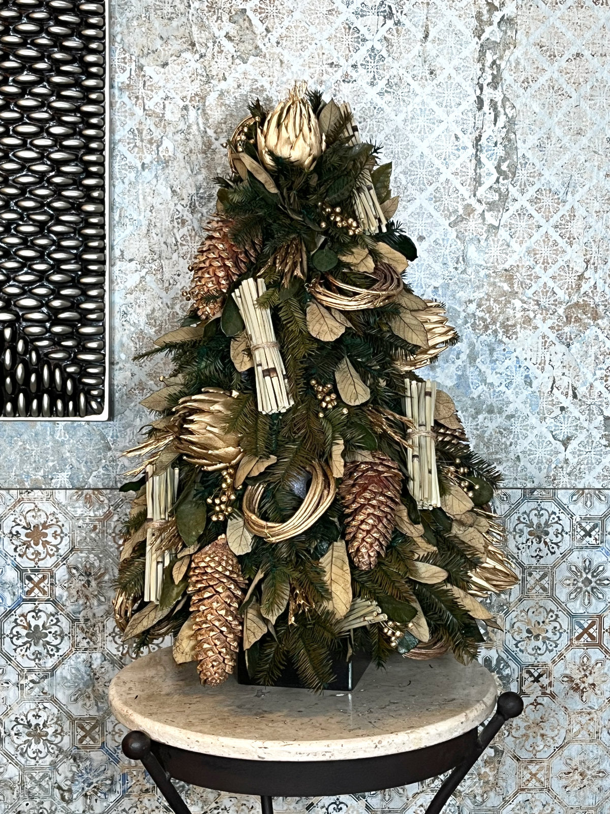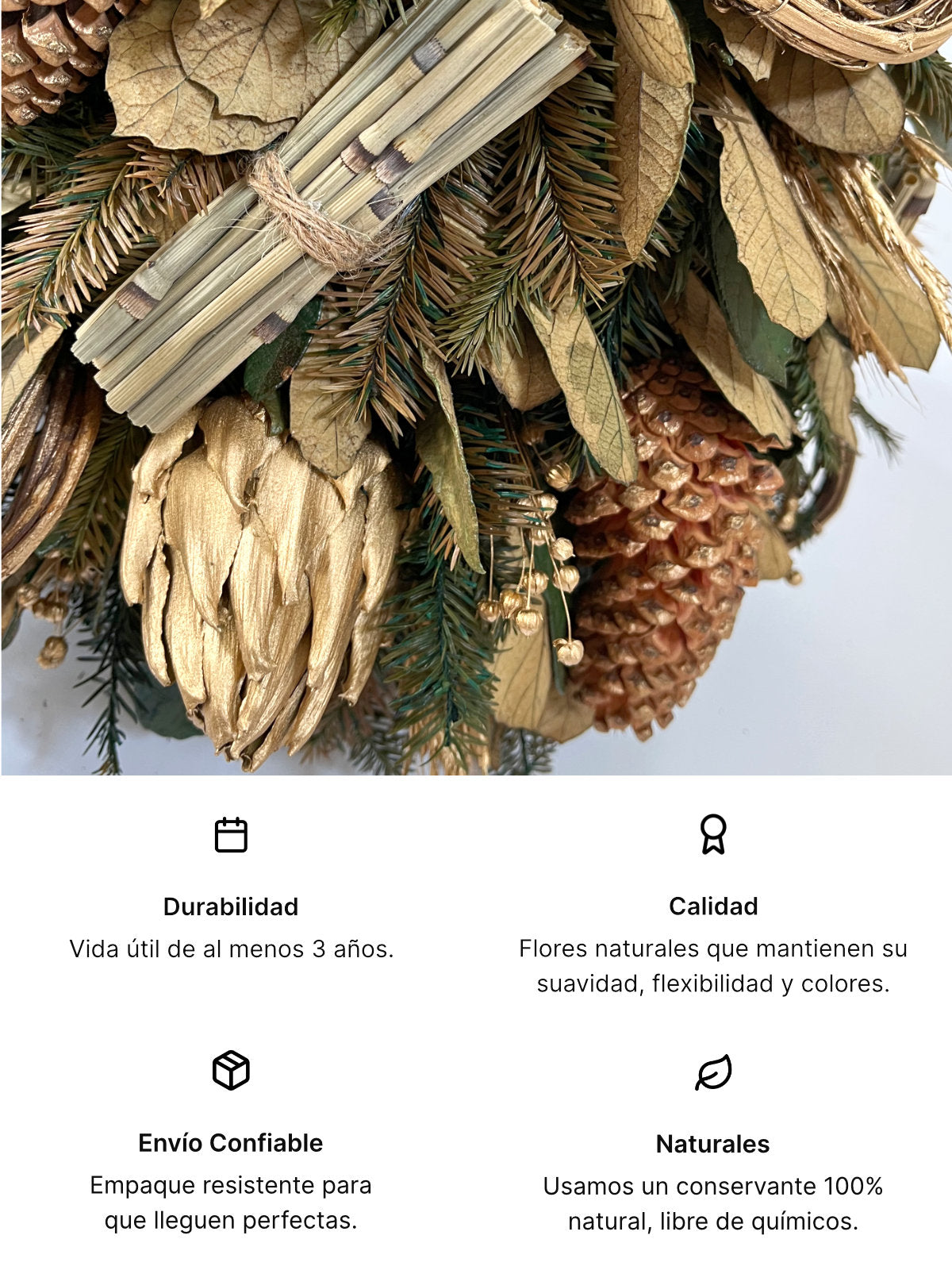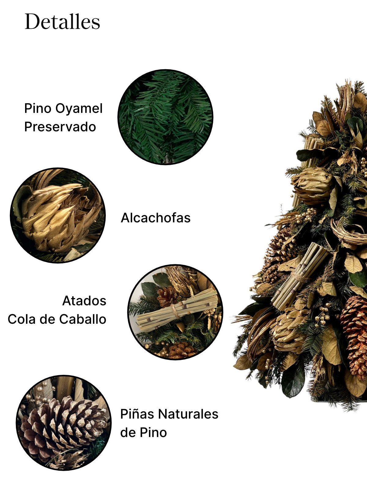 Arbolito navideño con encino, atado cola de caballo, perlita dorada, garapiñas, alcachofa, aros de vara.